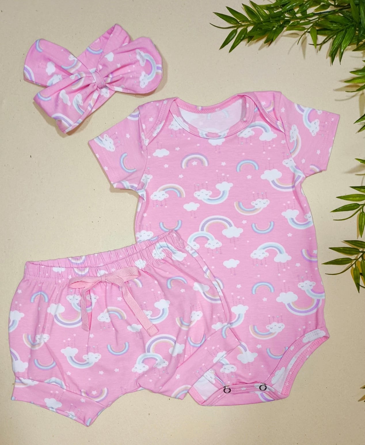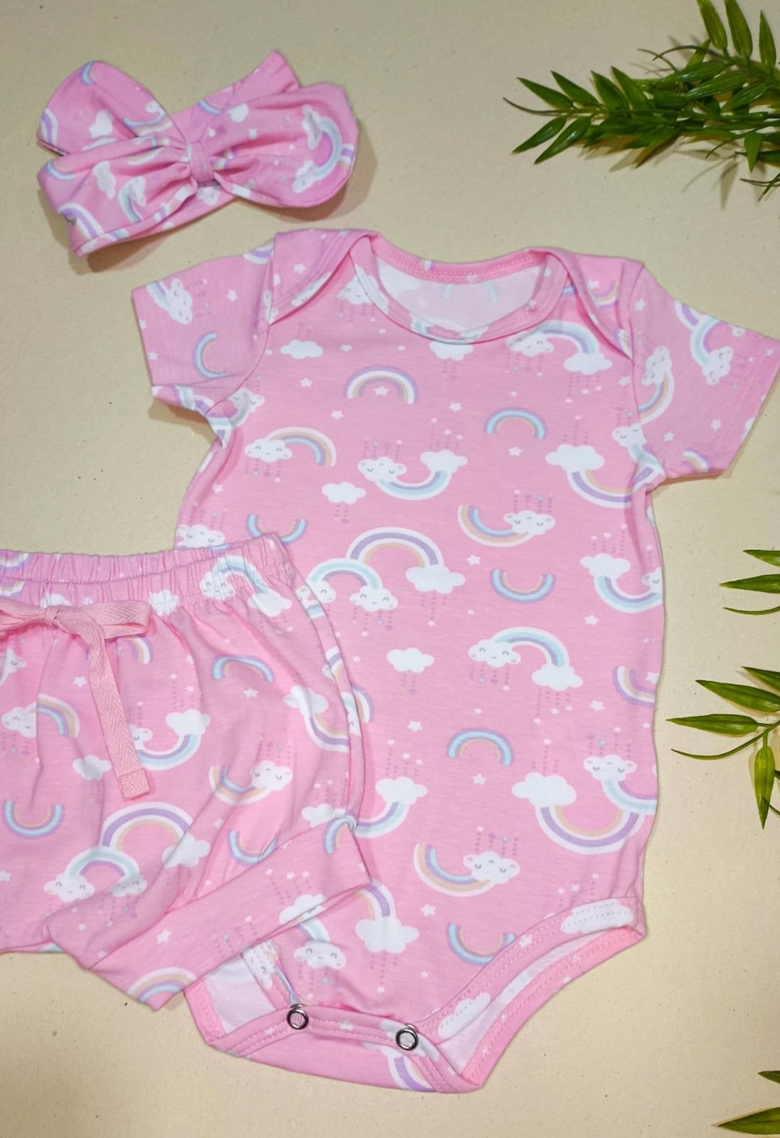 Esse conjunto é composto por body, short e laço, todos com uma estampa encantadora de arco-íris e nuvenzinhas sorridentes, trazendo aquele toque de alegria e ternura que a gente ama!