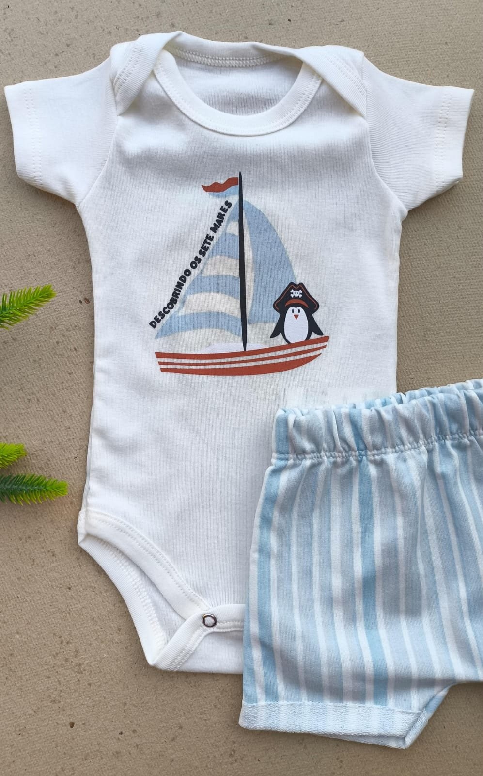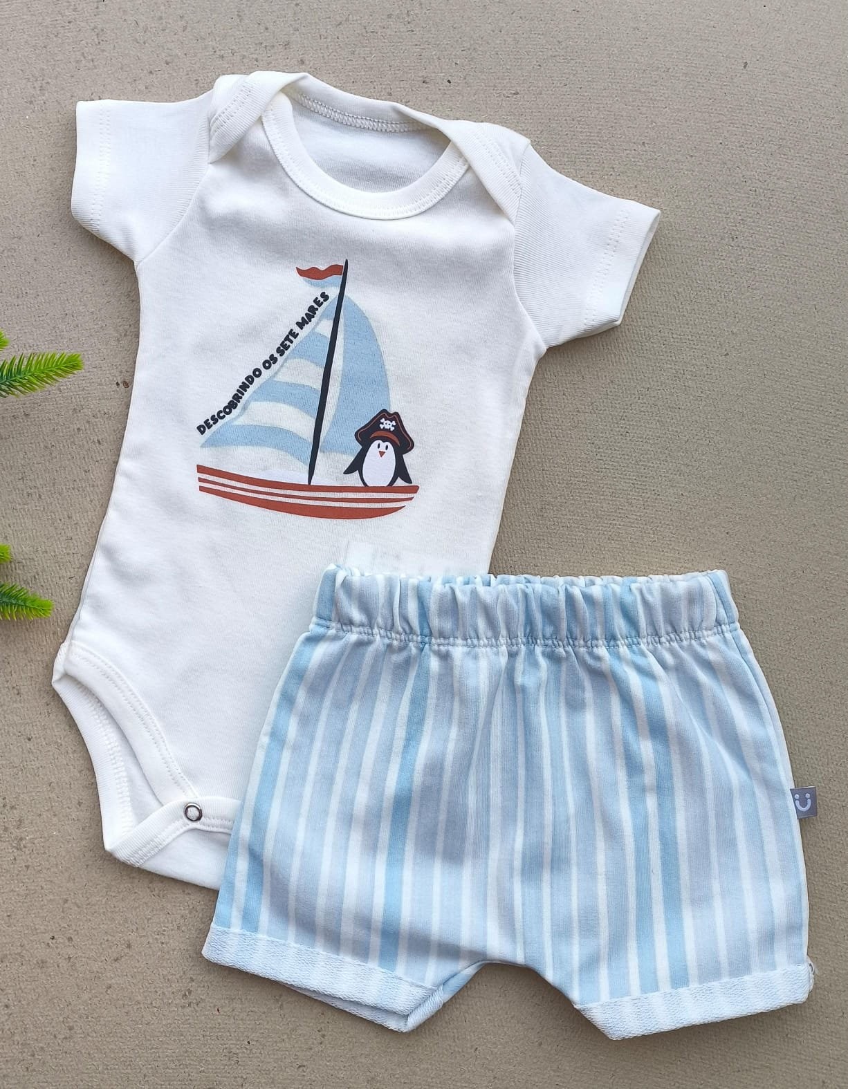 Body super macio com estampa náutica exclusiva — um pinguinzinho pirata que deixa tudo ainda mais divertido.