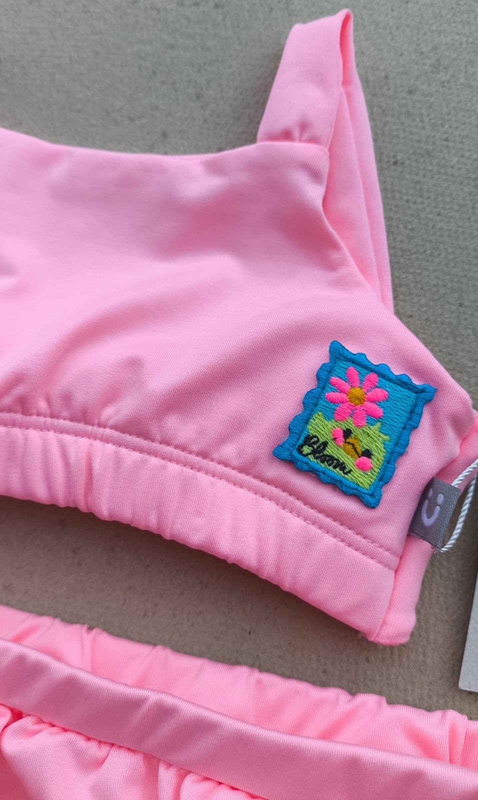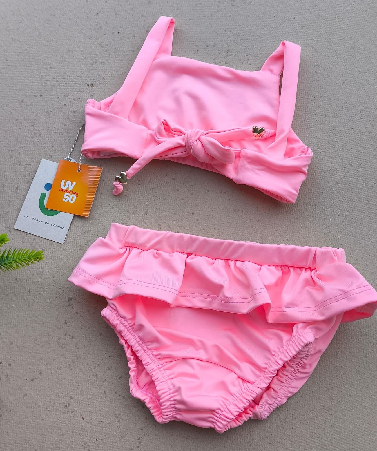 Confortável, leve e com proteção UV50+, este conjuntinho rosa é ideal para as pequenas aproveitarem a praia ou piscina com muito estilo e segurança.