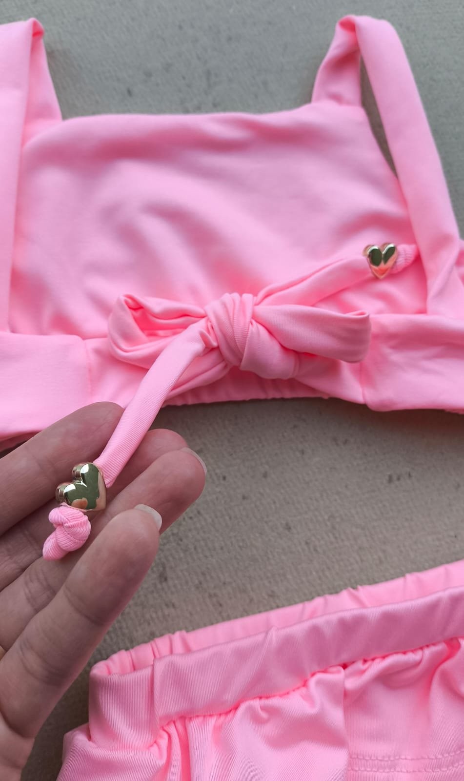 O top possui caimento impecável e detalhe bordado super delicado, amarração nas costas com pingente de coração, enquanto a calcinha com babadinhos traz aquele charme extra que derrete corações.