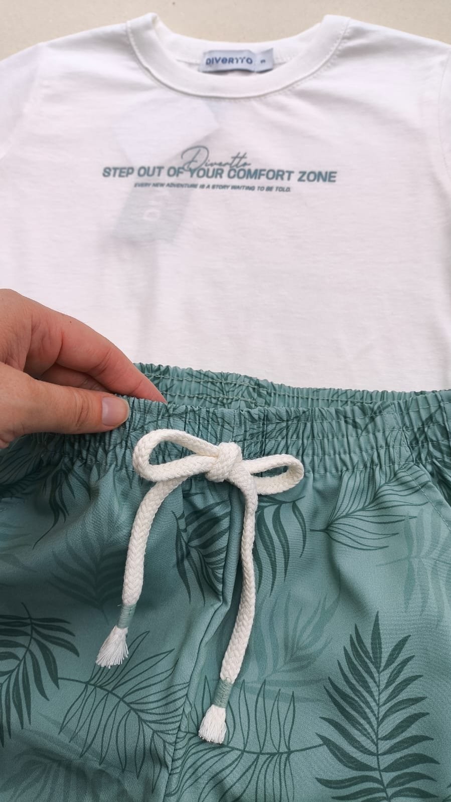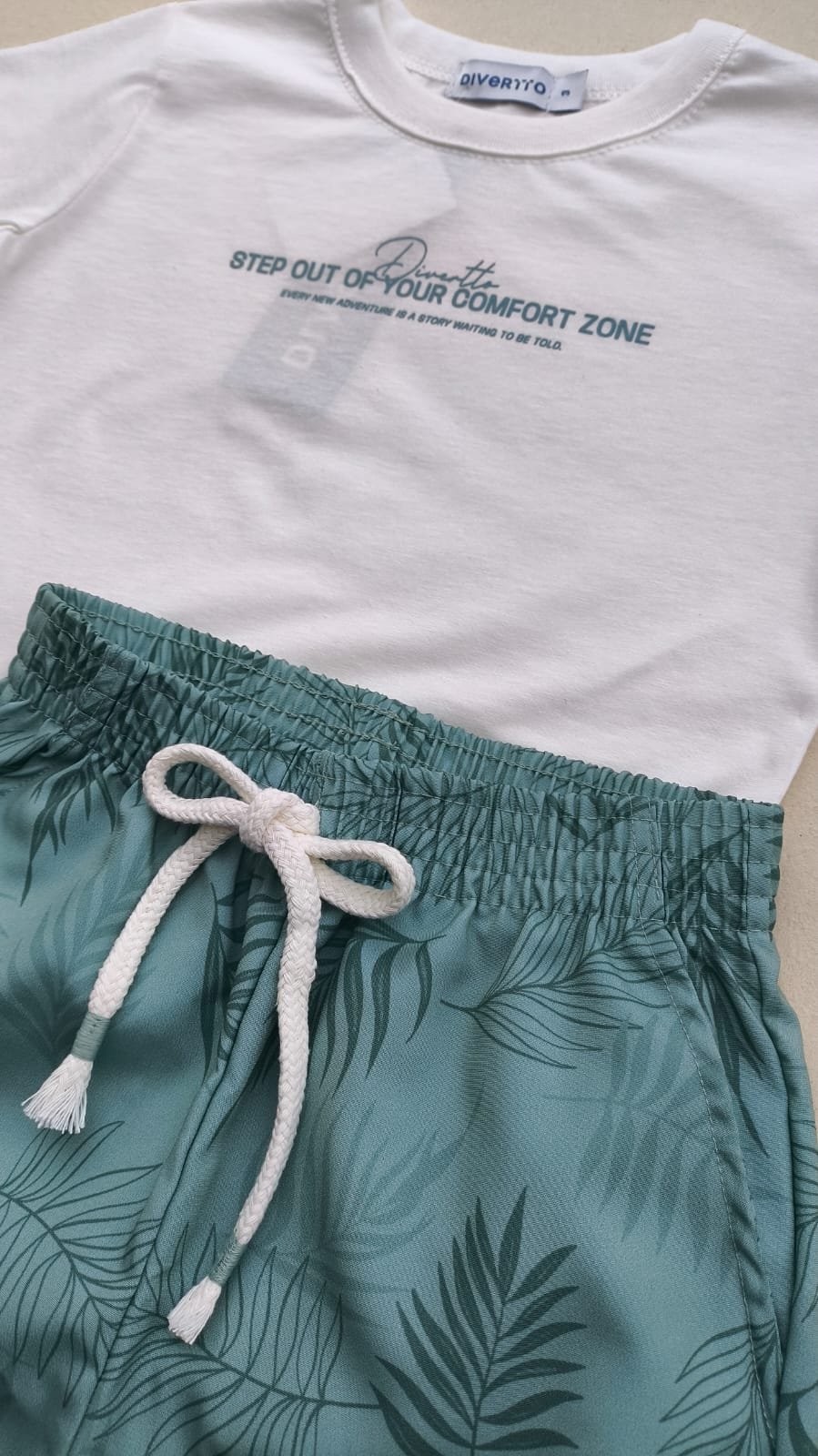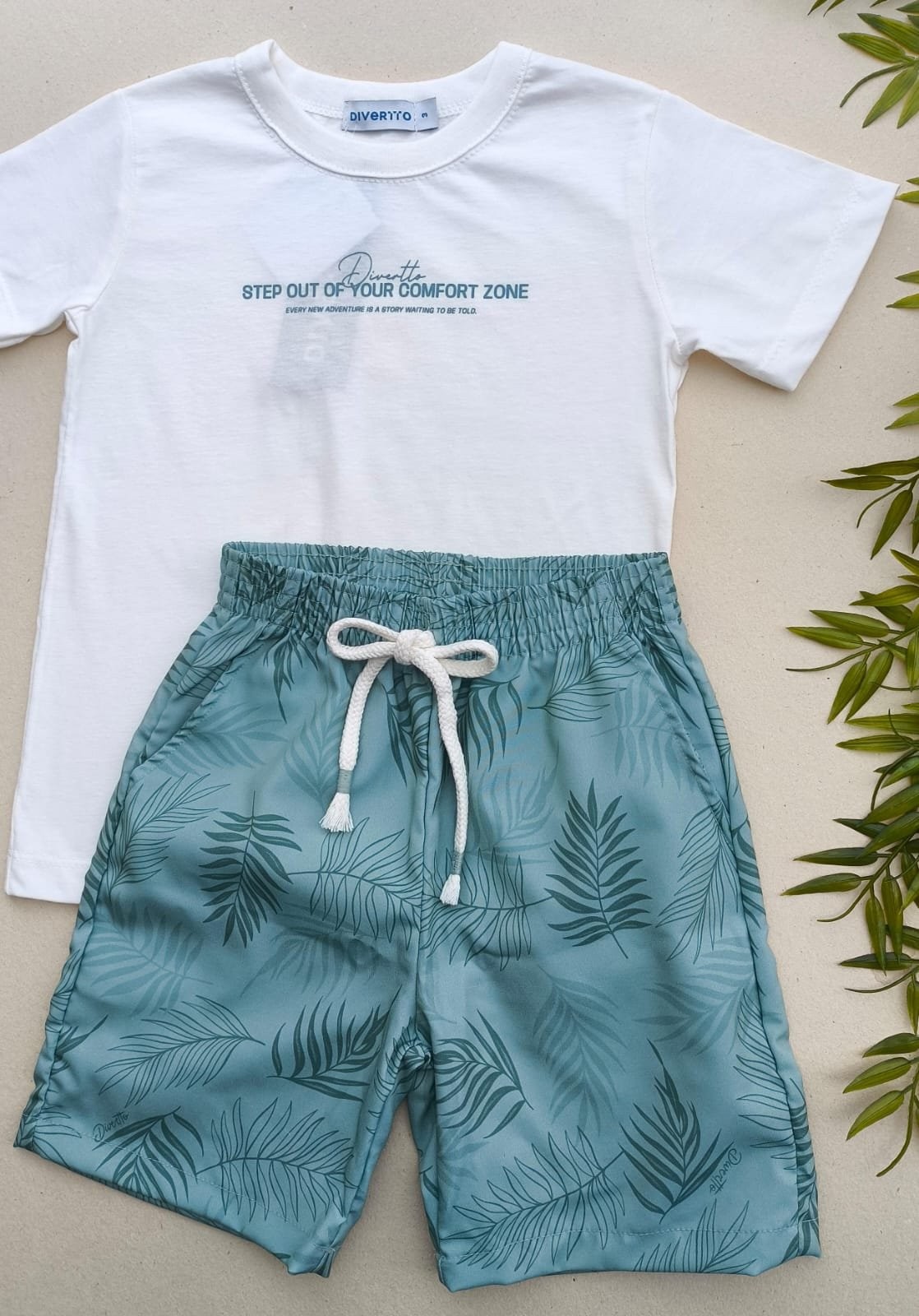 Esse conjunto é a combinação perfeita para dias cheios de diversão — camiseta 100% algodão super macia e bermuda com estampa tropical, em Tactel, com bolsos, que traz aquele toque de frescor e modernidade.
