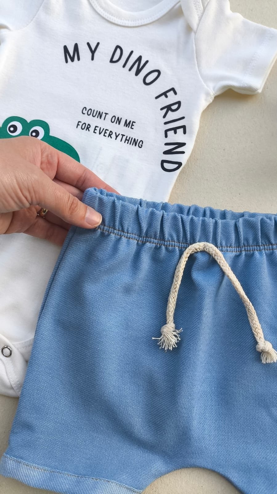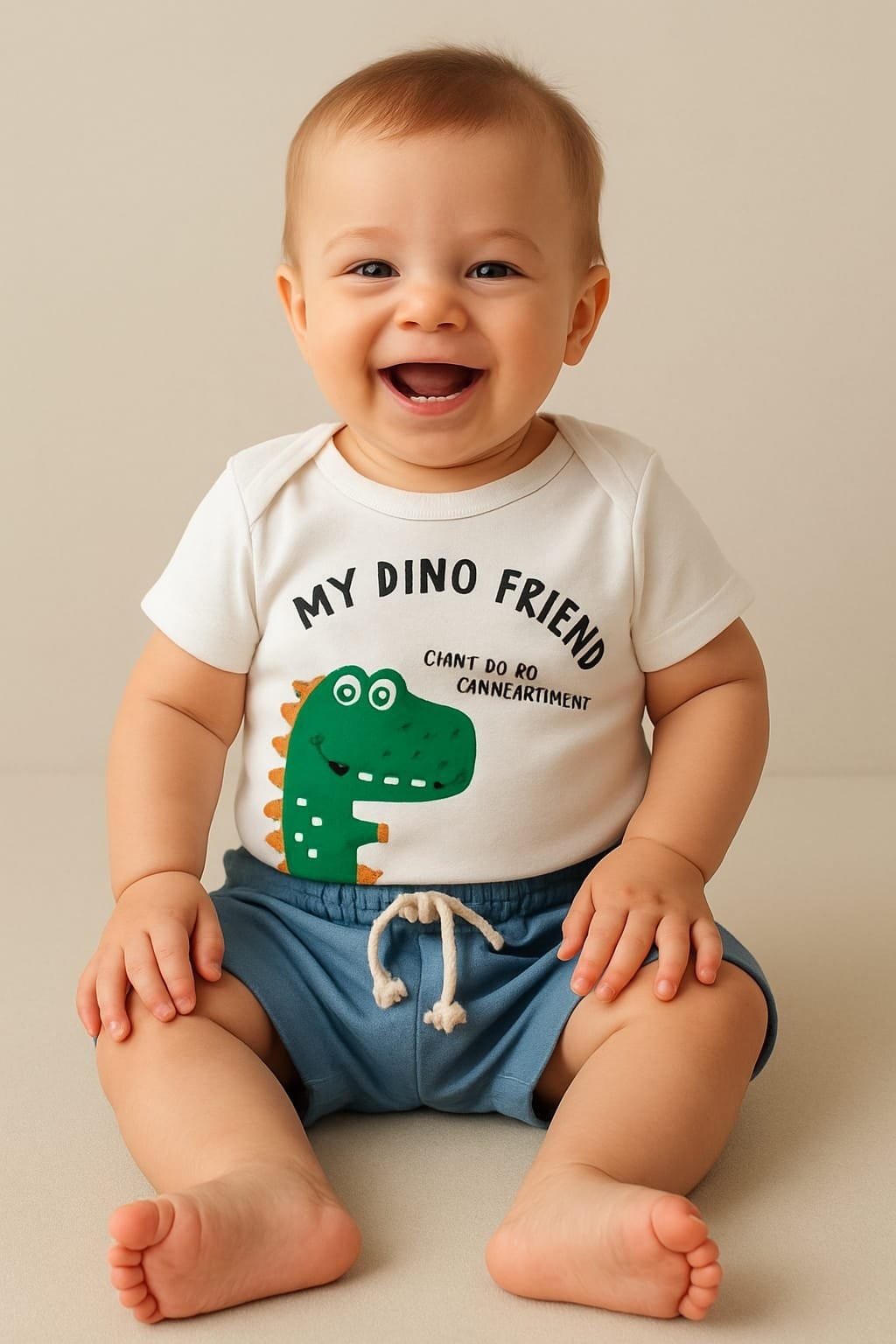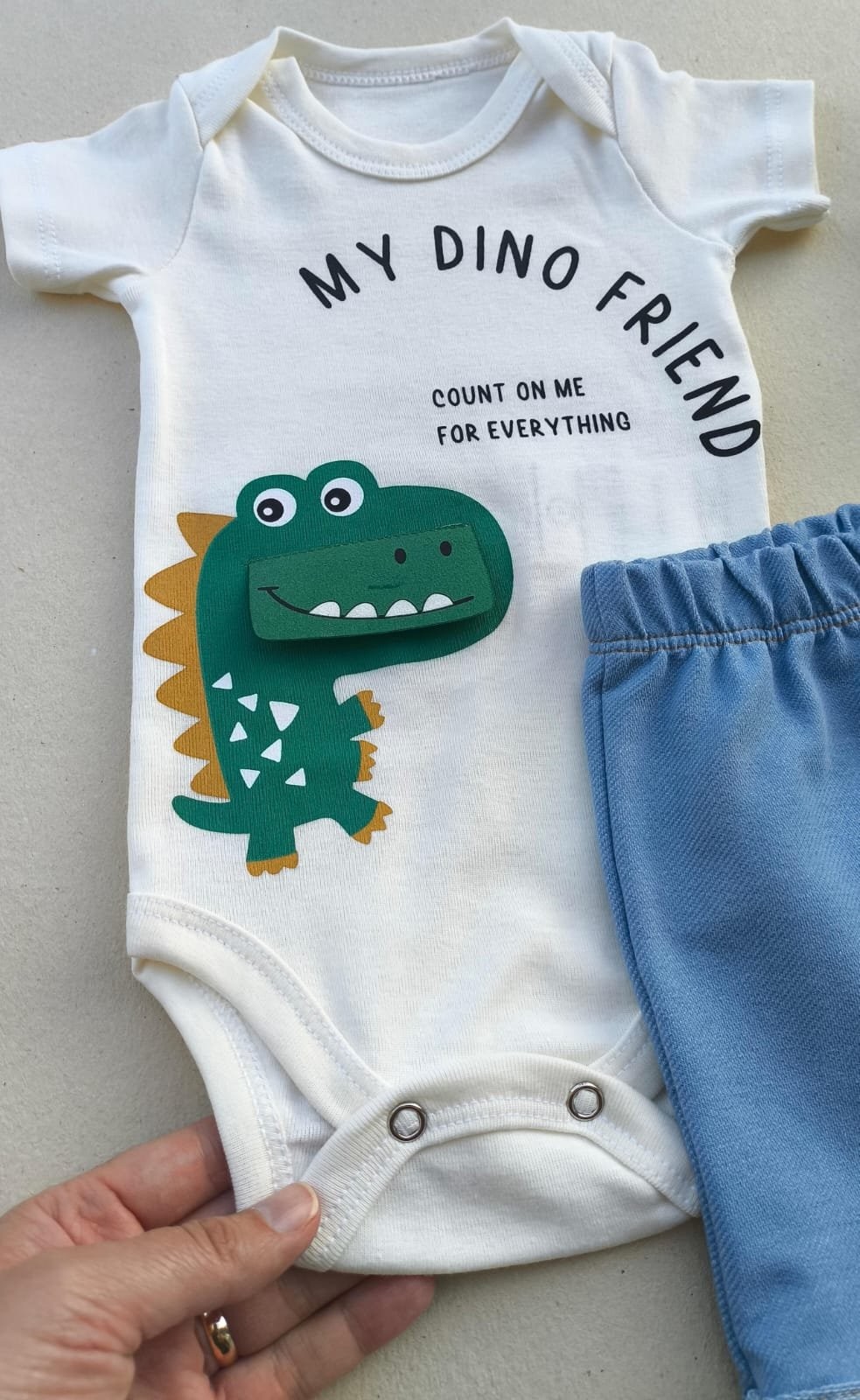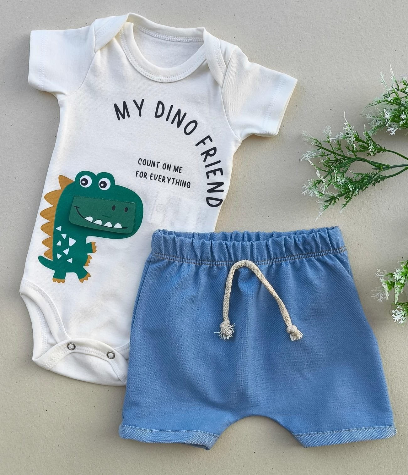 Conjunto “My Dino Friend” vem com detalhe interativo que deixa a brincadeira ainda mais divertida, acompanhado de um shortinho super macio, em sarja jeans, para total liberdade nos movimentos.