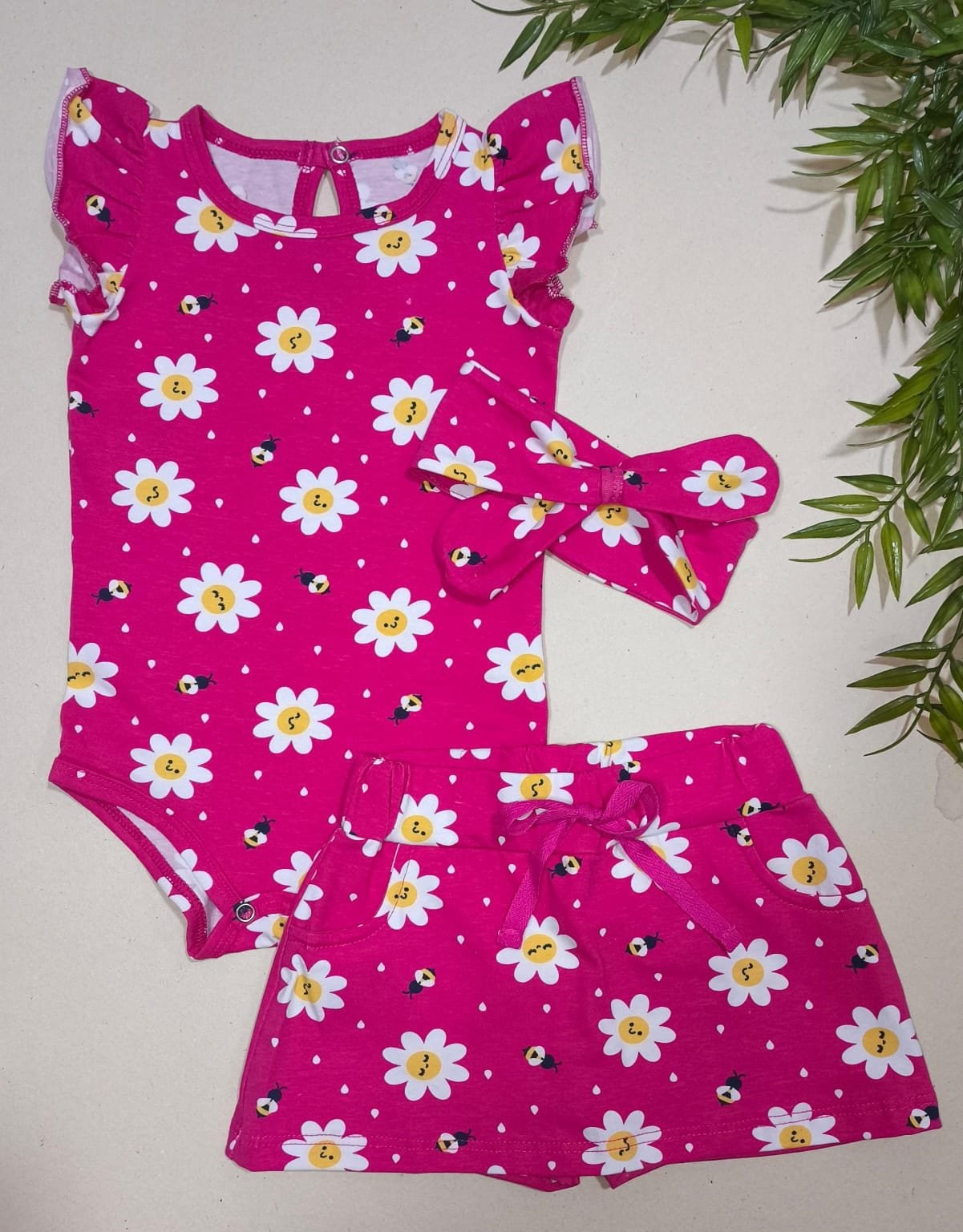 Esse conjunto com body, shorts saia e laço é puro amor — feito com 97% algodão e 3% elastano, garantindo maciez, frescor e liberdade para a sua pequena brincar à vontade.