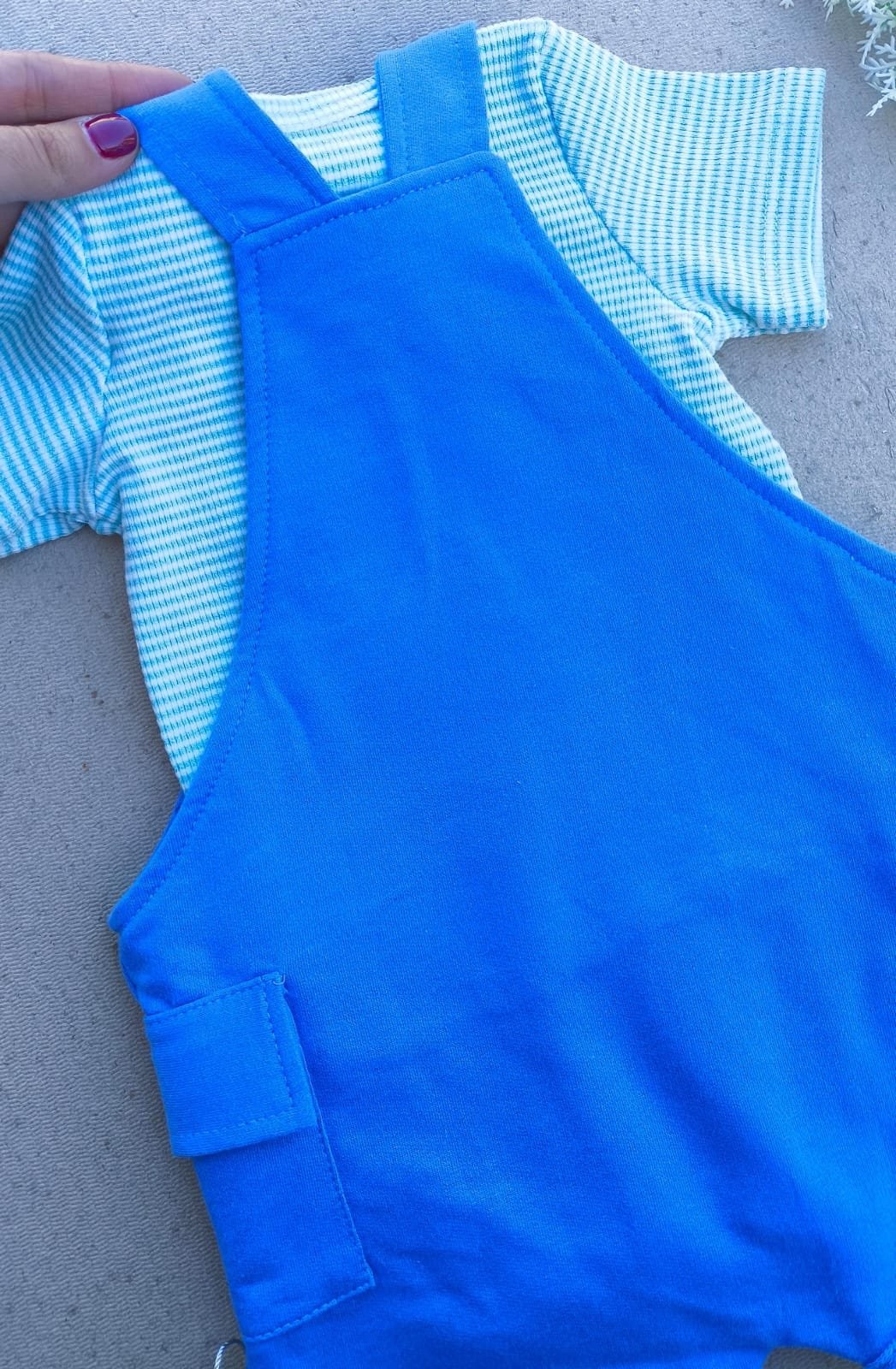 Jardineira em moletinho, alças de regulagem com botões e bolsos