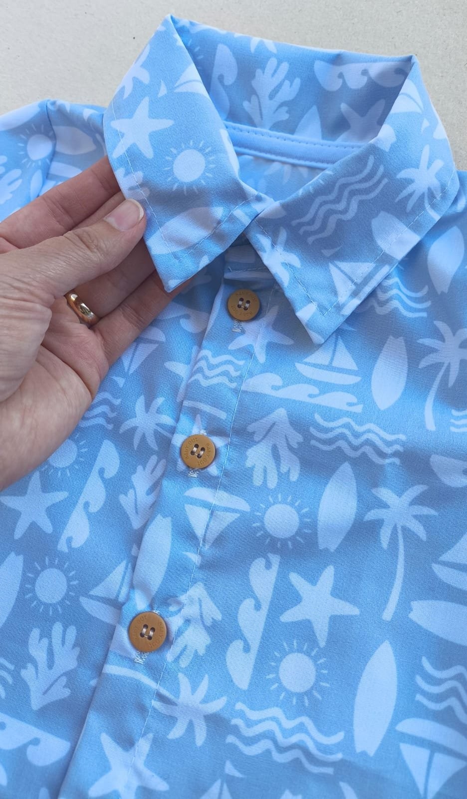 Esse look infantil traz frescor e estilo em cada detalhe: camisa com botões em madeira super charmosa, tecido leve e confortável que deixa a criança livre para brincar, e a estampa temática cheia de elementos do mar que deixam o visual ainda mais alegre e descontraído.