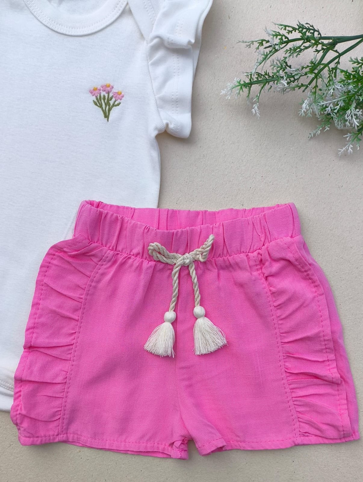 O body com babadinhos nas manguinhas e bordadinho floral transmite toda a ternura que a sua pequena merece, enquanto o short pink com babadinhos e cordão traz charme e liberdade para brincar à vontade!