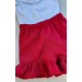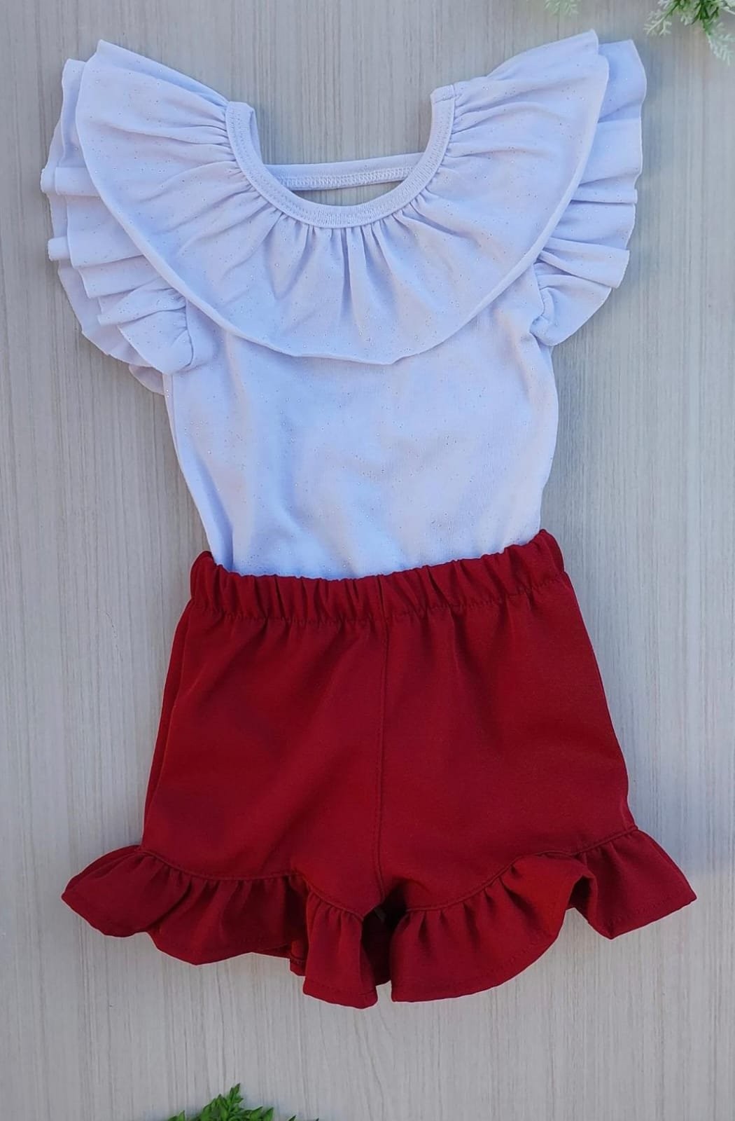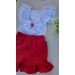 A blusinha branca com leve brilho e babadinhos delicados traz um toque de encanto, enquanto o short vermelho com babadinhos e o laço nas costas completa o look com um ar de fofura irresistível!
