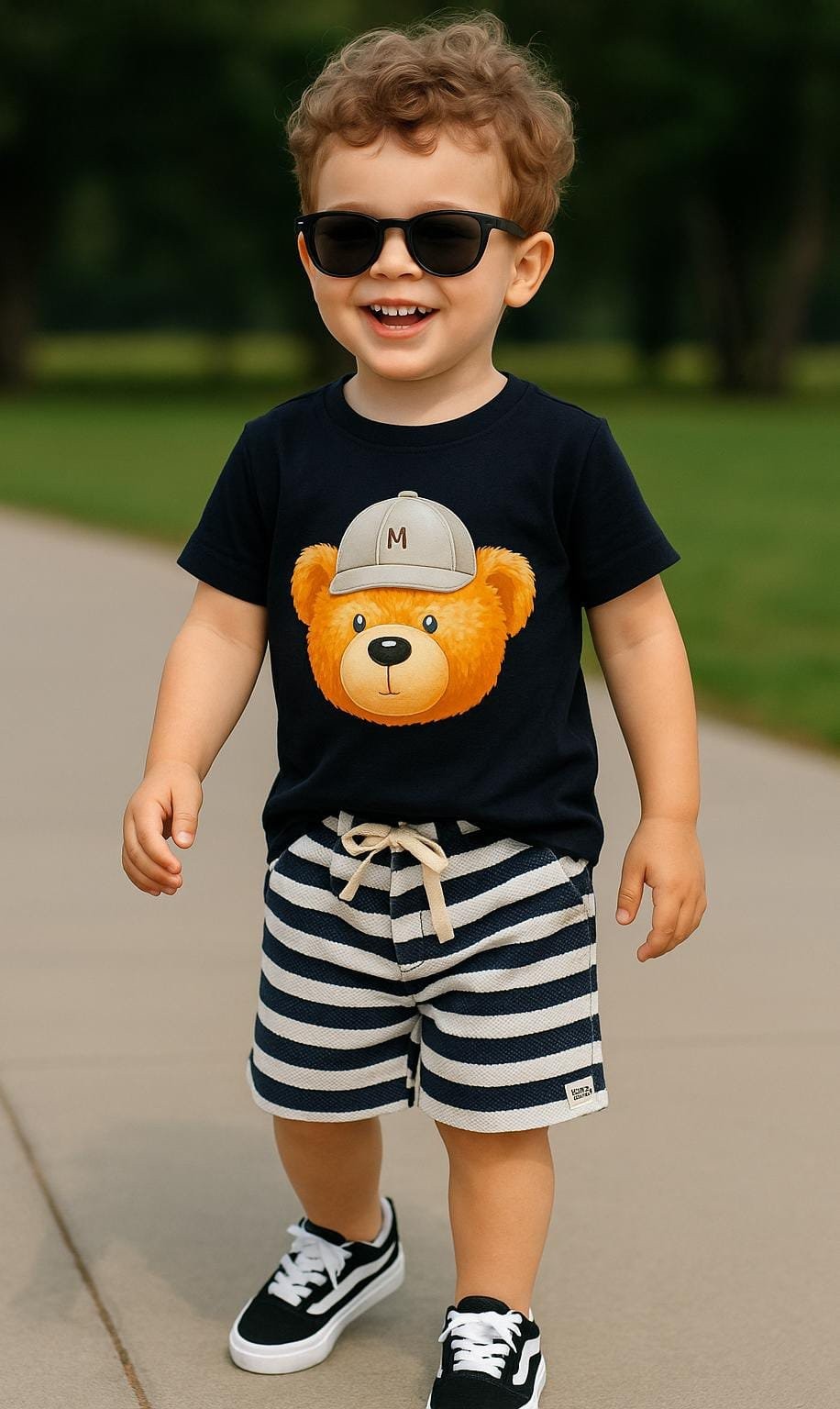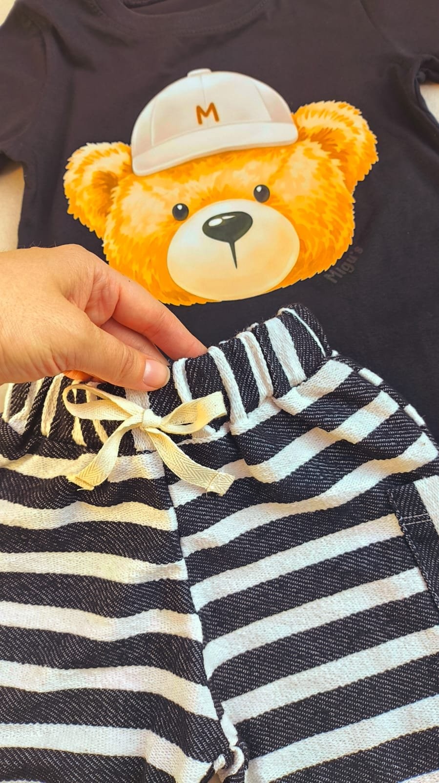 Esse conjunto é a escolha perfeita para os pequenos que adoram brincar com liberdade — a camiseta com estampa de ursinho traz aquele charme irresistível e o short listrado com bolso lateral é super prático e estiloso.