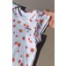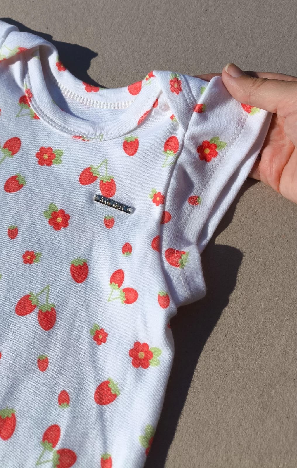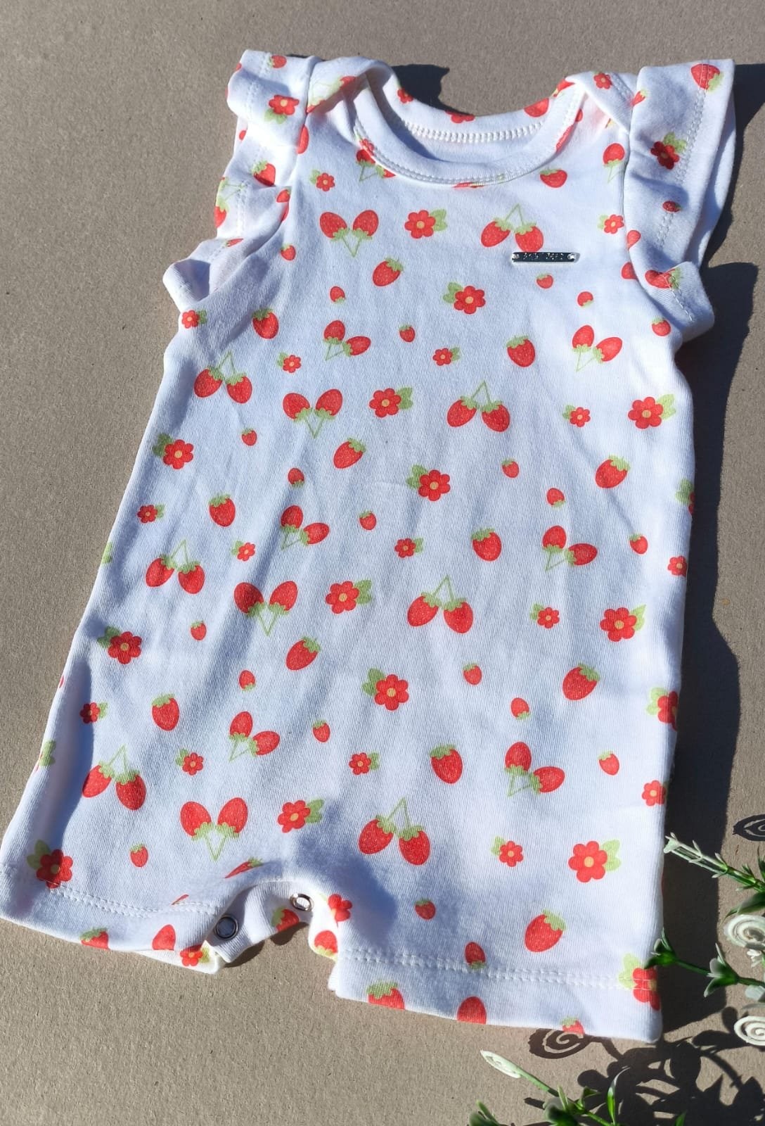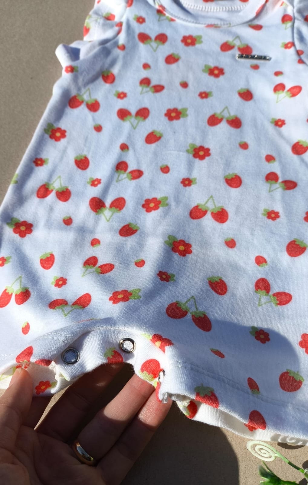 Estampa fofa de moranguinhos e flores, deixando o look ainda mais alegre.