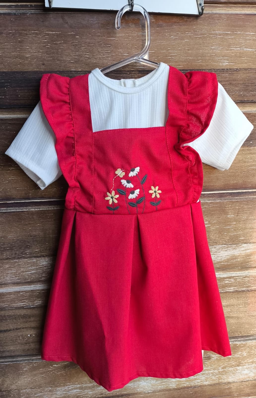 Nossa salopete embutida vermelha com bordado floral é pura fofura e encanto! Um modelo cheio de vida, com detalhes que destacam ainda mais a delicadeza da sua pequena.
