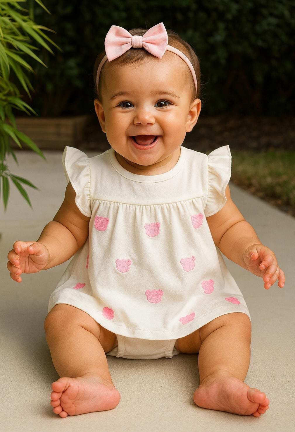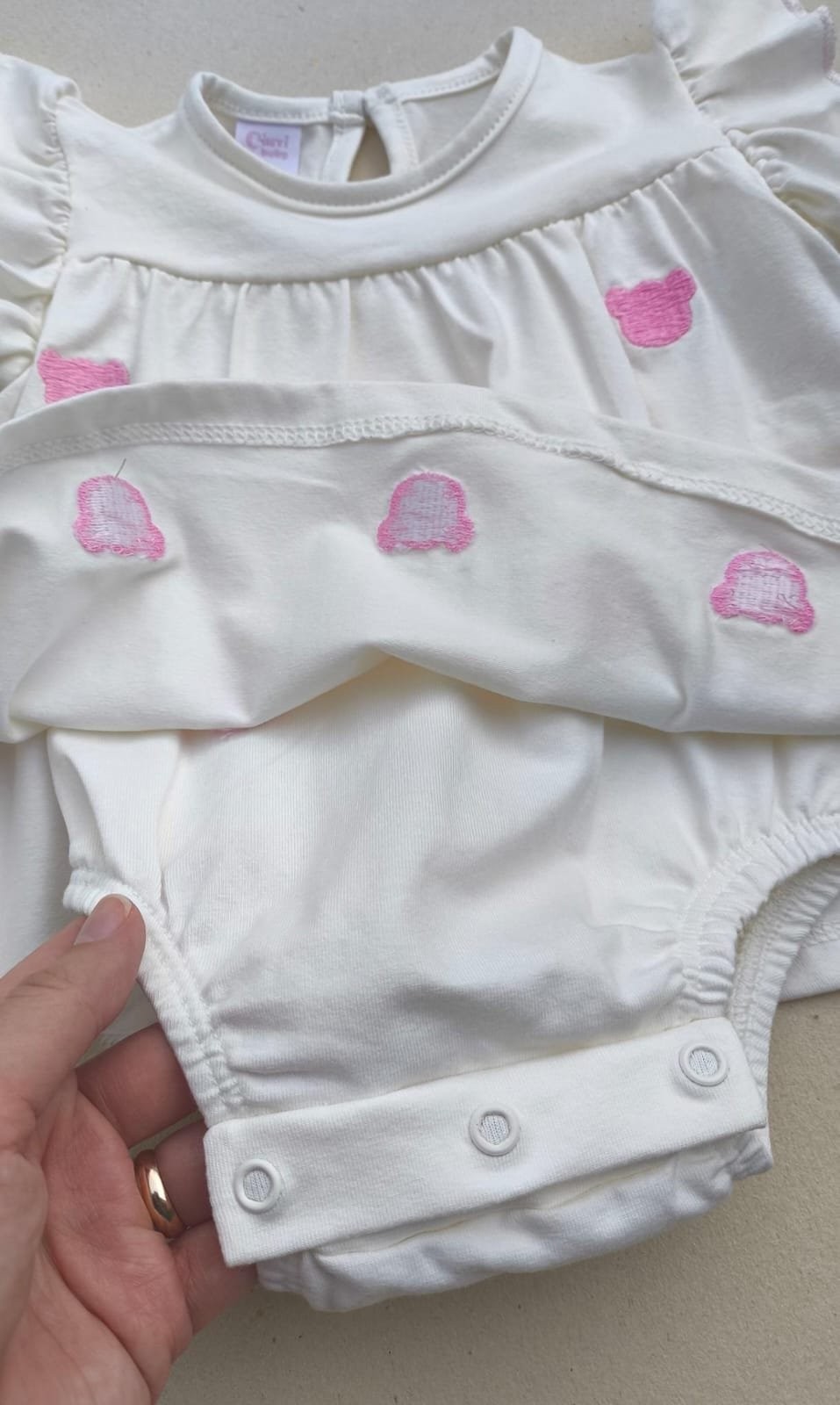 Vestido com fechamento em body, ursos bordados e babadinho
