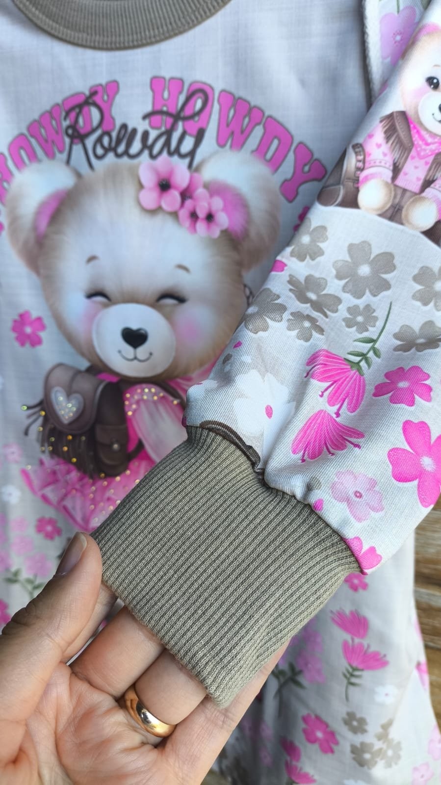 Esse vestido traz uma estampa exclusiva de ursinha cowgirl com flores em tons de rosa, perfeito para as pequenas que amam um look fofo e diferente.