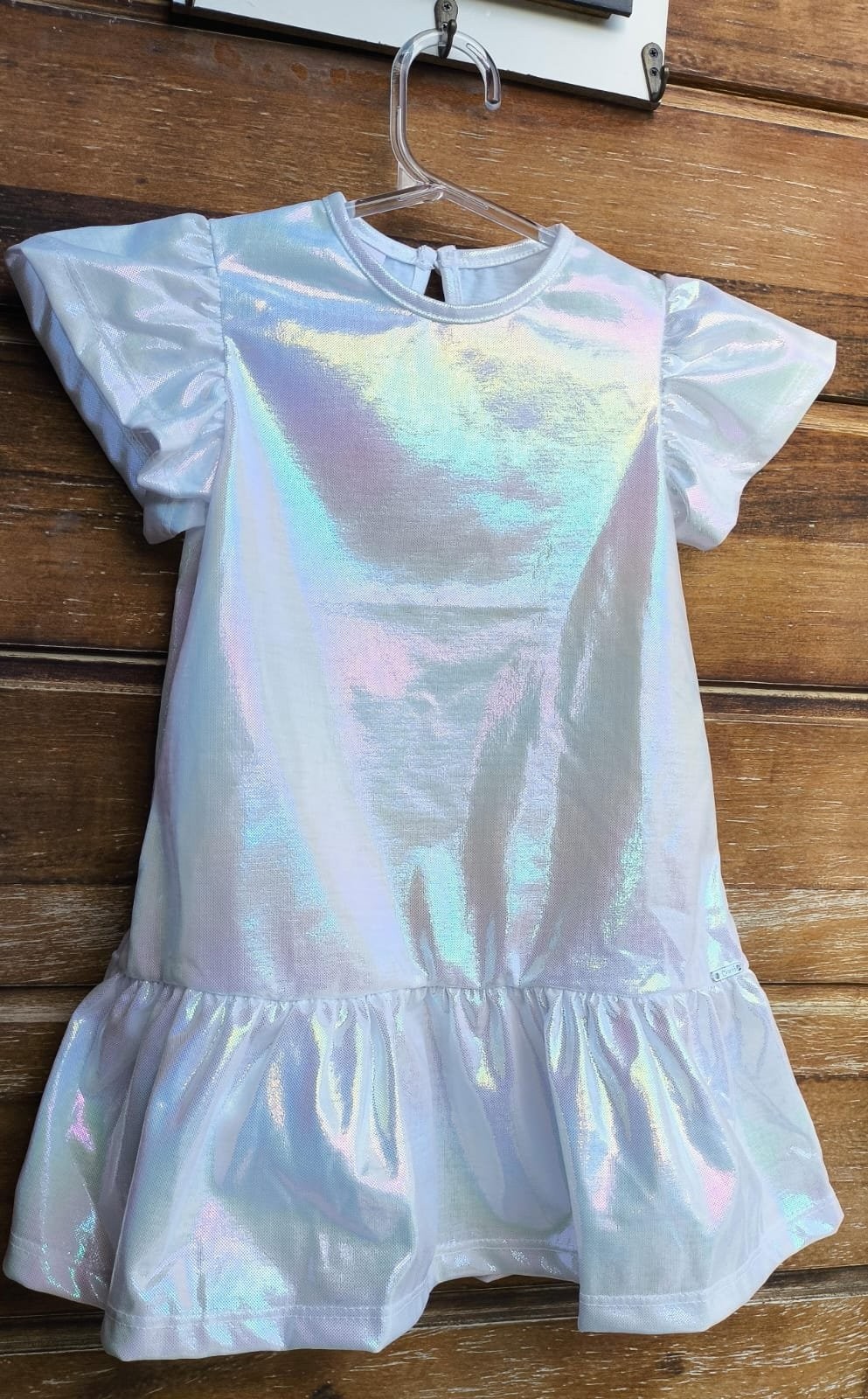 Quem vê esse vestido não resiste: tecido perolado com efeito cintilante, leve, confortável e com movimento encantador. Um look que ilumina, valoriza e deixa sua pequena ainda mais radiante — seja para uma festa, passeio ou aquele registro especial.